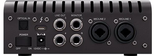 Rear view of the Apollo Twin X. Note the dual use XLR / TRS inputs, the locking power connection, multiple outputs, Thunderbolt III computer connection and Optical Input. The optical input is how I connect my distantly placed UA Ox Box