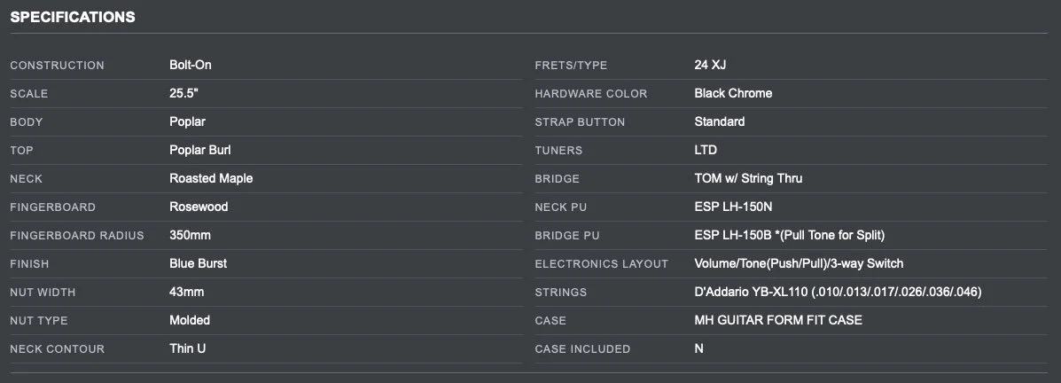 The guitar came with D’Addario YB-XL-110 strings 10-46. I don’t know what YB means, but the ball ends are not colour coded, and the strings didn’t feel great. After a couple of hours my fingers felt grungy and as I had been playing in low light, when I turned the lights on, my fingers were black. I grabbed some automotive grease removing hand cleaner which was needed to get the black off and then spent a good 20 minutes cleaning the factory strings. After that they played better and the guitar sounded better. I don’t know what was on the strings, but my guidance to ESP LTD is to stop doing whatever you are doing. Shipping a guitar with dull and filthy strings is a good way to ensure that potential buyers move along. Install plain old XL-110s and perhaps drop to nines and the buyer at this level is going to be a lot happier. Shit strings piss me off, but as this has been my ONLY complaint, perhaps it will matter less to you than to me. Some people blame the shop, but it’s pretty difficult for a shop to clean or replace strings on every new instrument that comes into the store. I am confident that if I was buying this guitar, it would be properly prepped before I left with it. And in my case, it is my habit to restring every guitar shortly after purchase if not before it leaves a store.