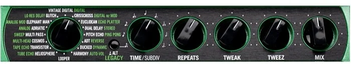 While the knobs time, repeats and mix are pretty clear to me in terms of what they deliver, Tweak and Tweet mean nothing to me, and what they do changes depending on the delay model that you are using. This kind of stuff makes me nuts, and is the reason I did not purchase a different makers delay some years back because labeling knobs Thing 1 and Thing 2 made my teeth hurt.