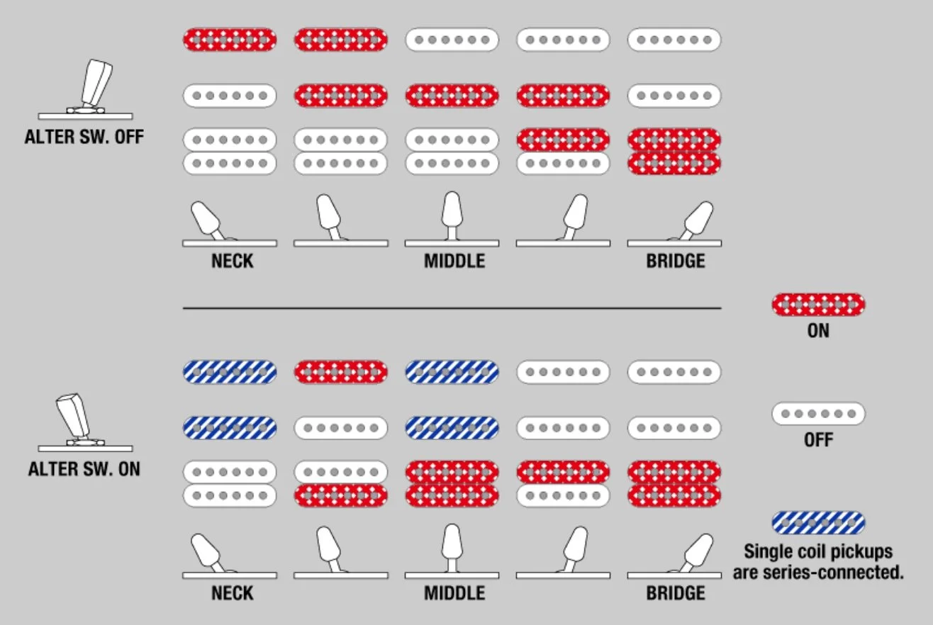 For this set of examples, I play a chord sequence and a riff with the Alter switch off in each pickup selector switch position from 1 to 5. I then play the same chord sequence and riff with the Alter switch on using each pickup selector switch position from 1 to 5.