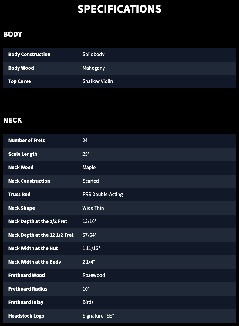 I pulled these direct from the PRS website so as not to mess anything up and to saving time composing this part of the review.