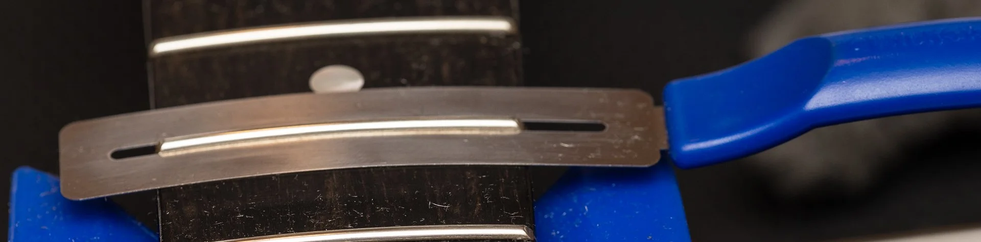 Then you place the knife edge anchor plate against the vibrato portion and hold it tight against it. Use a marker to note where you will have to drill two holes for the anchor plate. This is the only part of the install that is not drop in. It is the only modification made by the installation. Very minor indeed. No routing and none of the cavernous openings required by a Bigsby. Be cautious in making your marks to be the centre of the hole. If you will drill with the anchor plate in place, I strongly recommend using a self centering bit. I used a self-centering 1/16 bit, and had marked the bit with a black sharpie so I would know when to stop. Prior to drilling I used my sharp pointed awl to poke a divot in the mark as a guide for the drill. If you would prefer not to use a self centering bit, no worries. Use an awl to create the divot to centre the drill bit and if you can use a brad point bit, which cuts a much cleaner hole edge than a standard drill bit. I had both the self-centering bits and brad point bits on hand from my very amateur woodworking hobby but neither are expensive and you will find plenty of other uses for either. If you ever have to drill holes to mount hinge plates, get a set of self-centering bits and you will be very happy indeed.