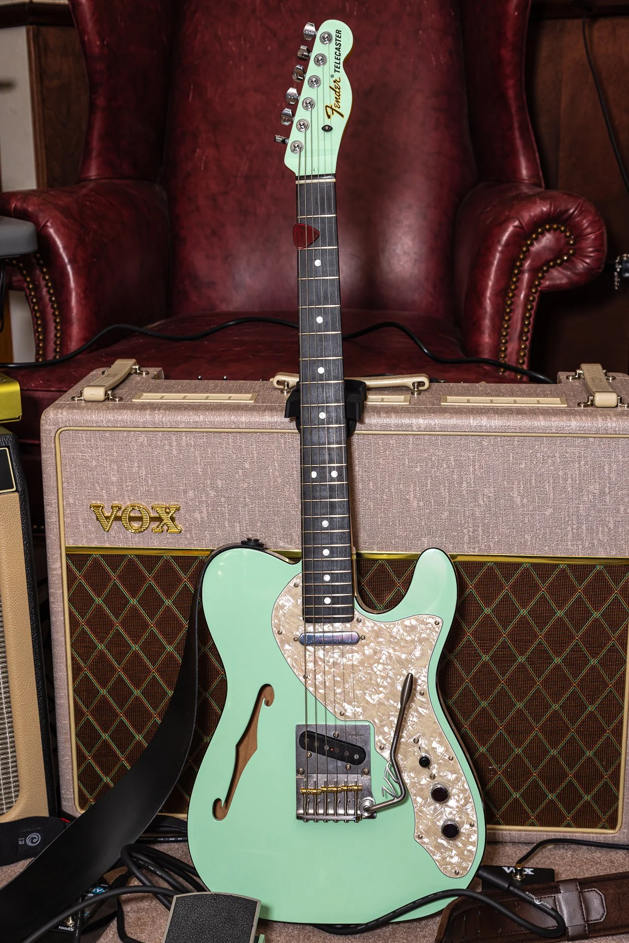 I had recently installed a VegaTrem VT-1 bridge and vibrato system on one of my Stratocasters. It is absolutely brilliant, certainly the best Stratocaster vibrato system that I have ever used. This convinced me in short order to try one of the VegaTrem VT-2 vibrato systems for a Telecaster, so I went through the guitar room to pick a Telecaster. I chose this three year old American Telecaster Limited Edition. The top and headstock are done in the classic California seamfoam green under a gloss coat and the sides and back are bright white under the same gloss. It is a semi-hollow body and has pretty darn good sounding pickups and electronics. It has a satin finished maple neck and an ebony fingerboard that is extremely comfortable to play. So I had found the guitar to do the VegaTrem VT-2 upgrade on.