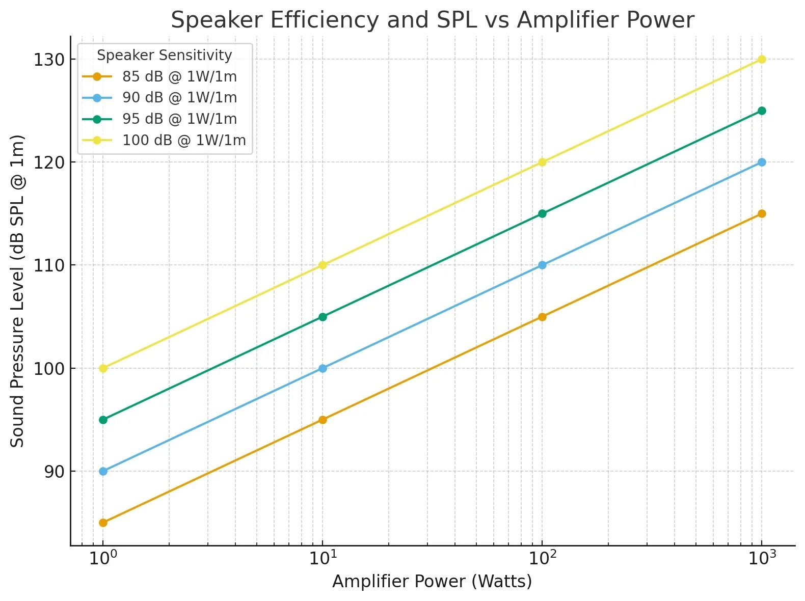 • High-efficiency speakers: 92–100+ dB SPL @ 1W/1m