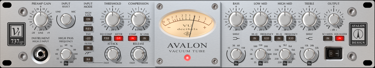 The samples are very short. The first sequence is just a really basic chord progression using the sub bass whole note for each chord. The second is just the individual sub bass strings plucked with my thumb. The final track is an equal mix of the Ghost Piezo output and the Aston Origin microphone. The guitar and the microphone went direct into the two front inputs on a Clarett 8pre and from there directly into Logic Pro. After recording the tracks simultaneously with no processing I added UA Avalon VT-737sp preamp to each track. The settings are shown below. Very neutral overall with minor compression. No other post processing was done before bouncing the tracks down to a single MP3. I give full credit to Paul Casey for the idea to go with the Avalon pre instead of my typical Neve 1084. I liked the results a lot and will be using it for recording acoustic instruments as I move onward.
