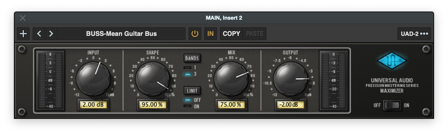 I set LUNA up so the channel strip was the Helios type 69 in the UNISON slot, so I set to taste before recording and recorded with the Helios type 69 live in real time with no latency. Note that the UA build of the Helios type 69 is incredibly accurate and it can have an audible noise floor. I made a buss with a UA Precision K Stereo Ambience Recovery plugin, and sent the tracks direct to the Main and also sent a 50% value from each track to the buss. In the mastering stage I used a UA Precision Buss Compressor and a UA Precision Maximizer. The tracks were mixed down to an MP3 using VBR. For those interested, I have included screenshots of the settings on my plugins.